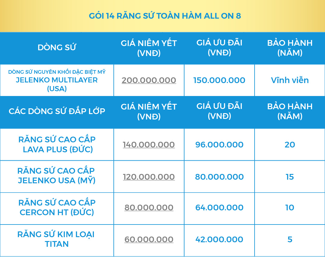 (Giá trọn gói đã bao gồm 8 Implant + 8 Multi Abutment và 14 Răng Toàn Sứ)