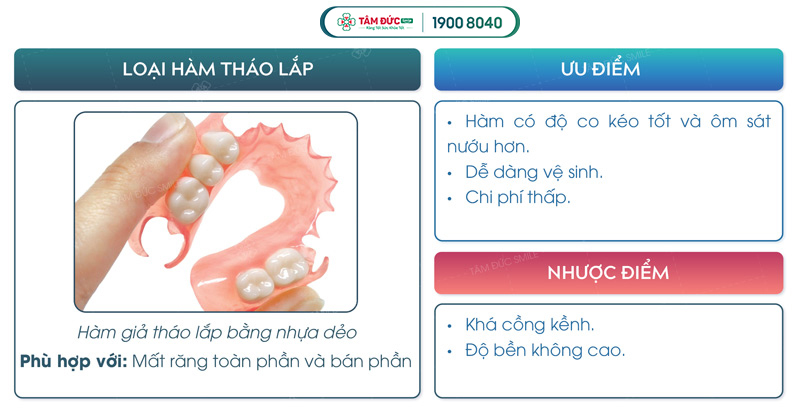- Vệ sinh dễ dàng: hàm giả tháo lắp dễ tháo rời, dễ vệ sinh, giúp hạn chế những bệnh về răng miệng.
