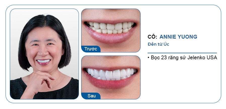 Sau khoảng 20 năm bọc răng sứ ở nước ngoài, răng sứ cũ của cô Annie bị xuống cấp, ngả vàng, gây viêm đen viền nướu và ăn uống khó khăn. Bác sĩ thăm khám và tư vấn cho cô Annie bọc 23 răng sứ Jelenko USA.