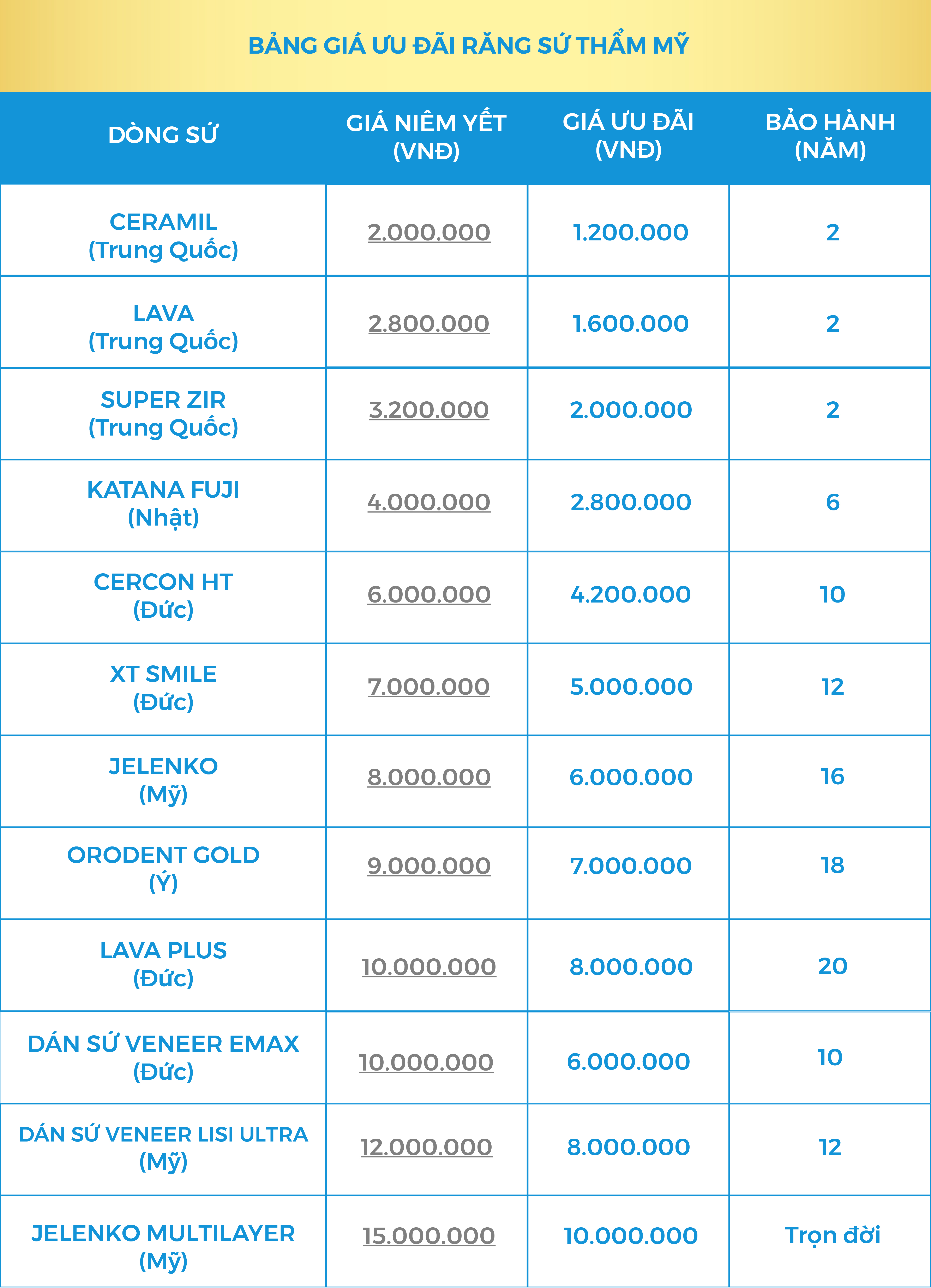 Hiện tại, Hệ thống Nha khoa Tâm Đức Smile sở hữu nhiều dòng răng sứ chất lượng được nhập khẩu chính hãng từ Hoa Kỳ, Đức, Italia, Nhật, Trung Quốc... với độ bền lên đến vĩnh viễn. Mức giá răng sứ được tính trên một răng, giá ưu đãi được áp dụng khi Quý khách đặt hẹn online qua bảng tư vấn bên dưới hoặc gọi đến Hotline: 0329851079 (Có sử dụng Zalo/Viber).