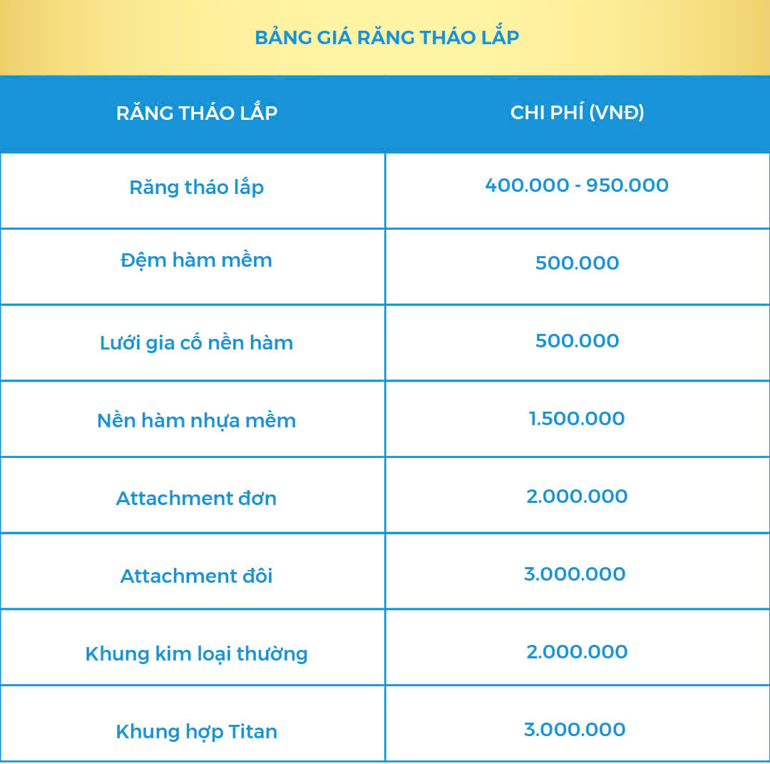 Dưới đây là bảng giá răng tháo lắp mới nhất tại Hệ thống Nha khoa Tâm Đức Smile, tuỳ vào từng tình trạng răng miệng cụ thể, bác sĩ sẽ đưa ra chỉ định phù hợp sau khi Quý khách đến thăm khám trực tiếp. Nếu Quý khách cần tư vấn thêm, vui lòng liên hệ với chúng tôi qua qua bảng tư vấn bên dưới hoặc gọi đến Hotline: 0329851079 (Có sử dụng Zalo/Viber).